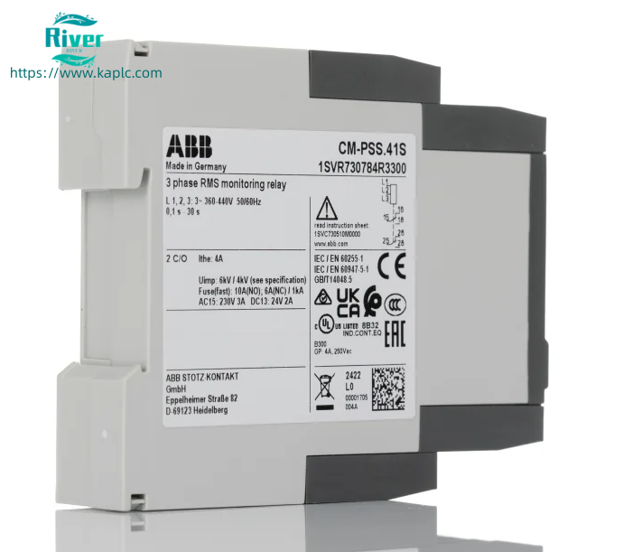 ABB 1SVR630884R3300 (CM-MPS.41) is a multifunctional three-phase monitoring relay from ABB’s CM series. It supervises three-phase power systems (300–500 V AC) to protect motors, generators, and critical equipment against phase loss, incorrect sequence, overvoltage, undervoltage, and phase unbalance.